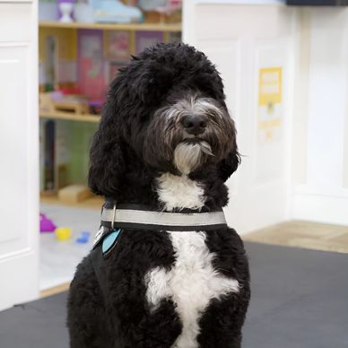 Koko is also our transition helper, making tough goodbyes a little easier and new situations a little less scary. As a proud S.T.A.R. Puppy graduate, he’s got the smarts and the charm to brighten everyone’s day.