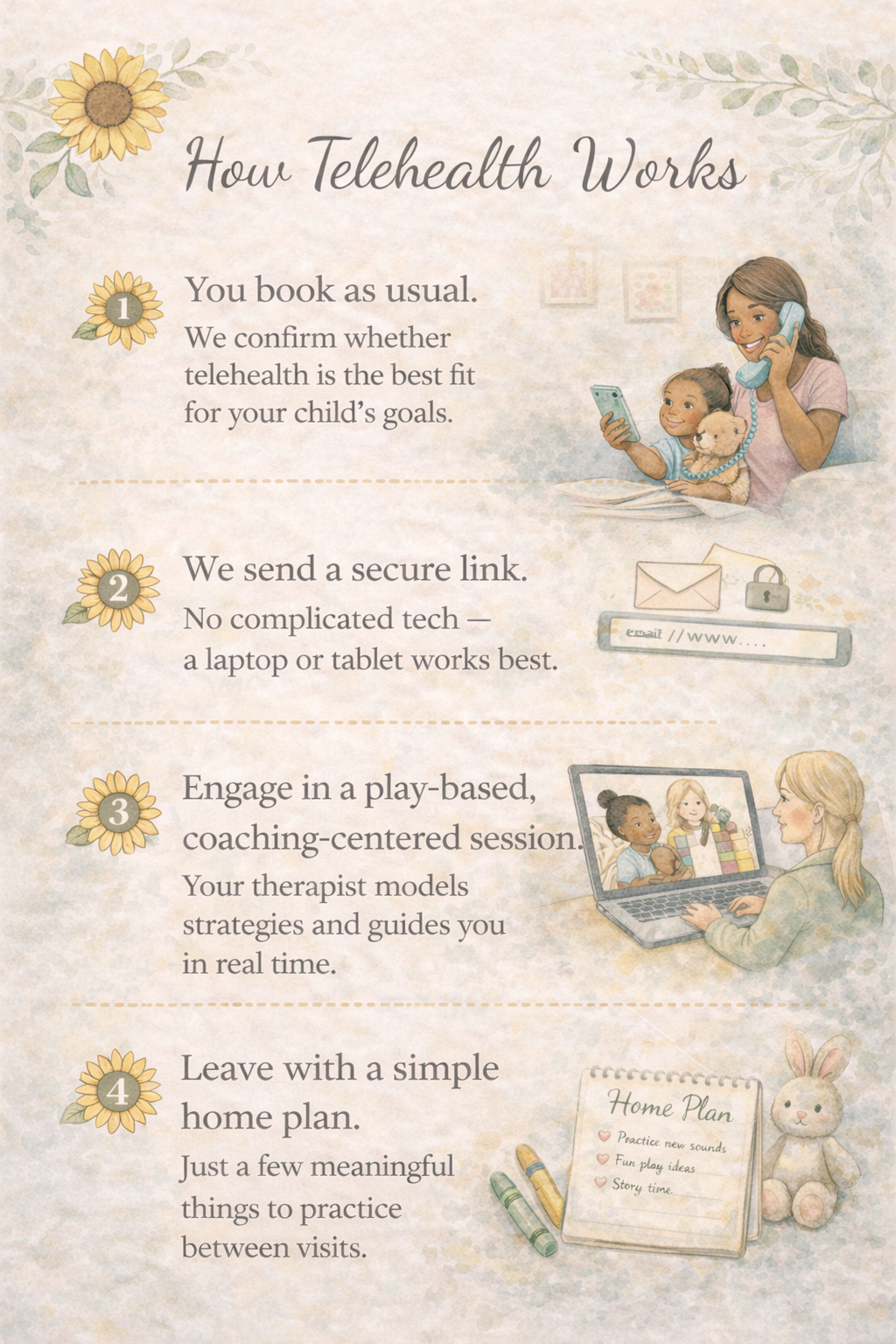 We offer secure, live video sessions for speech, occupational, and feeding support—guided by a licensed therapist and built around your child’s everyday routines. Families love telehealth because it’s convenient, consistent, and still deeply personal.